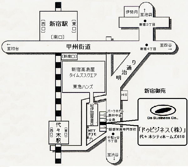 ●新宿高島屋より明治通りを渋谷方面に徒歩3分 〔最寄り駅〕 ●JR・小田急線・京王線新宿駅南口より徒歩7分 ●JR新宿駅新南口より徒歩5分 ●JR山手線・総武線代々木駅東口より徒歩3分 ●営団地下鉄丸ノ内線・都営地下鉄新宿線新宿三丁目駅より徒歩10分 ●都営地下鉄大江戸線代々木駅より徒歩5分 〔お車の方〕 ●明治通りの反対側に100円パーキングがあります。